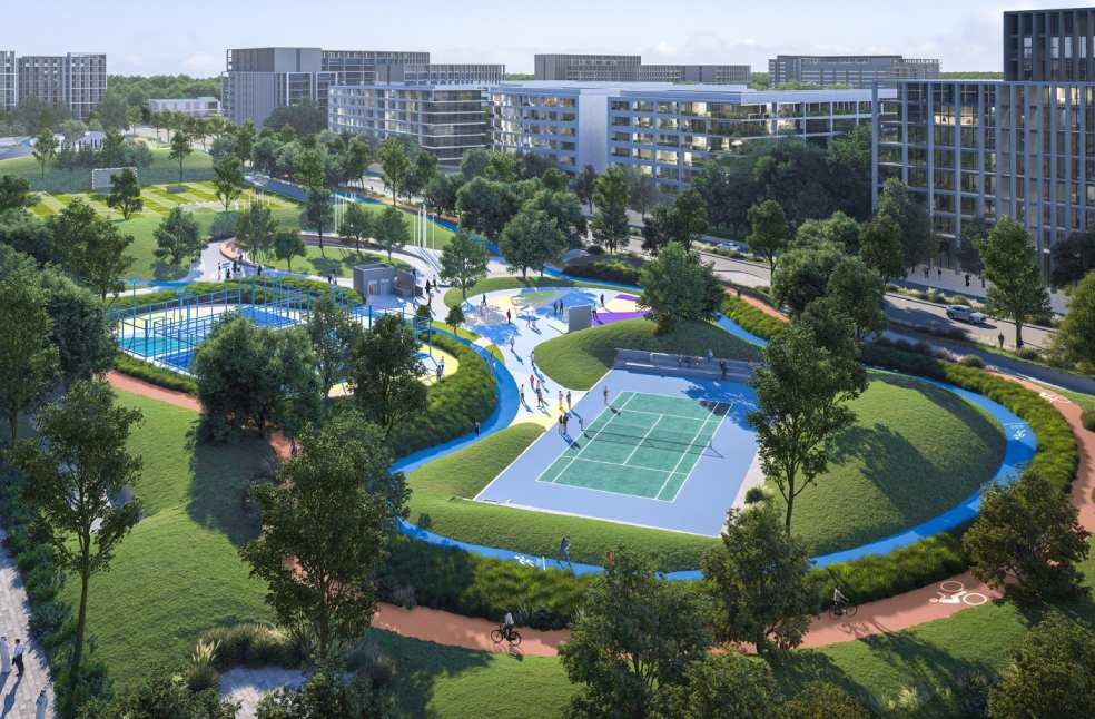 Spread over a 400,000 square foot landscaped park, the sports complex contains a full-size football pitch, smaller 5-a-side football pitches, basketball, padel tennis, volleyball, squash and badminton courts, as well as cycling and jogging tracks and adventure play areas for children.